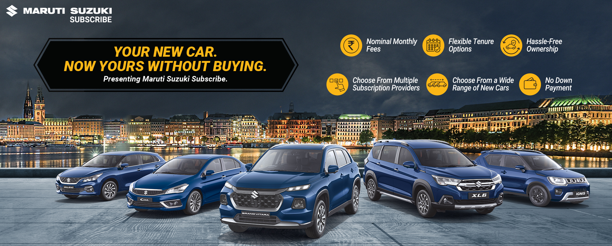 Maruti Suzuki Subscribe enables all customers to enjoy driving their preferred Maruti Suzuki cars without having to deal with all the financial responsibilities that come with owning a car.All you need to do is opt for a monthly subscription plan at a fixed monthly fee, which includes the routine maintenance and insurance costs, and choose a flexible tenure. At My Car in, , Mumbai, all Hatchback, Sedan, SUV, the MUV models line-up includes Baleno, Invicto, EVitara, Jimny, Ciaz, Ignis, Fronx, Grand Vitara, XL6. Here, you will enjoy Maruti Suzuki Subscribe benefits such as: